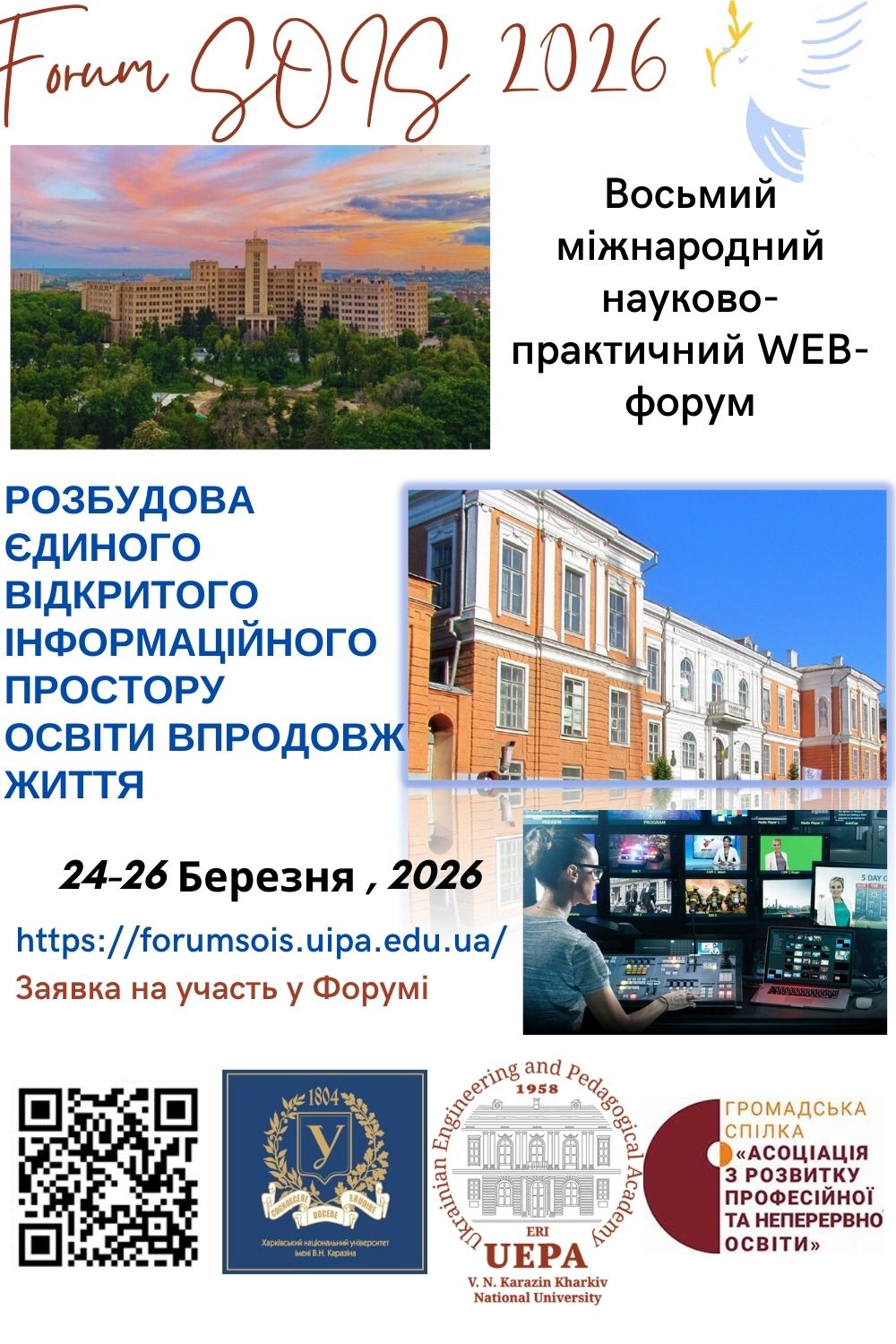 Запрошуємо науковців, науково-педагогічних та педагогічних працівників, здобувачів вищої освіти, котрі здійснюють наукову, освітню і навчальну діяльність у царинісоціальних та психолого-педагогічних наук взяти участь у роботі VIII Міжнародного науково-практичного WEB-форуму «FORUM SOIS, 2026: РОЗБУДОВА ЄДИНОГО ВІДКРИТОГО ІНФОРМАЦІЙНОГО ПРОСТОРУ ОСВІТИ ВПРОДОВЖ ЖИТТЯ», який відбудеться 24-26 березня 2026 року на базі Навчально-наукового інституту «Українська інженерно-педагогічна академія» Харківського національного університету імені В.Н. Каразіна (Харків) https://uepa.karazin.ua/ та Державної науково-педагогічної бібліотеки Україниімені В. О. Сухомлинського (Київ) https://dnpb.gov.ua/ua/.